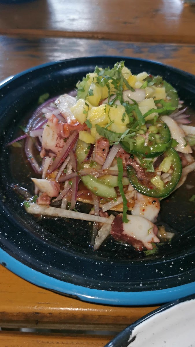 I had 6 oysters and the Corn and Shrimp (Esquite) and several happy hour margaritas. The margaritas had very little alcohol so I added a shot to each. After adding the shot they tasted like margaritas from other places I go in Ajijic. The oyster were good, but the Esquite was fabulous . I will go back just for that. The service was excellent. All in all worth the stop.