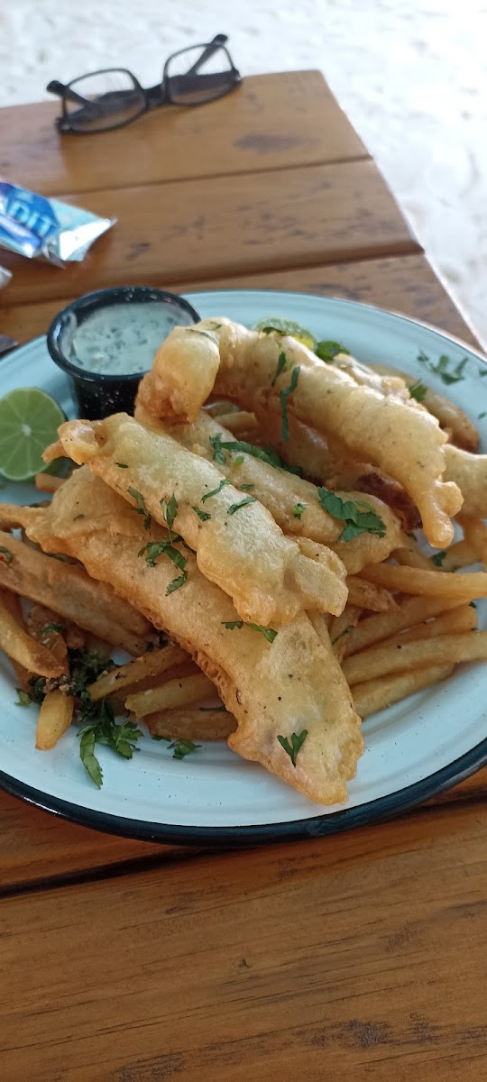 Great beach vibe. The decor is very cool with half of the restaurant having a sand floor like you're eating on the beach. They had live music which was nice. Food was normal and prices were fair. Service was good maybe a little slow but hey, you are in Mexico. Probably the biggest turnoff was about three or four street dogs that kept roaming through the restaurant coming up to our table looking for snacks. The staff was kind enough to put bowls down of what I'm assuming were table scraps for them to eat. Glad to see someone was taking care of them but having dogs roaming around under your table while you're trying to have dinner was not enjoyable.
